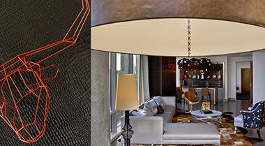 Rough yet refined, intertwined in a culture both high and low, Dallas is expressively masculine and profoundly feminine. Proud and stubborn, yet genuine and unapologetic. It is a city of contrasts, grandeur, celebrity and spectacular wealth. It is in this intersection of glitz and glam, high and low and hyper-gender fantasy where we find our inspiration. Twisted woven ropes, durable ageless denim, individual malleable hides, the luscious viscosity of oil, the distressed surfaces of weathering wood, and the unashamed brandishing of immense gems are just a few of the locally derived tactile inspirations embraced. Honky-tonks, themed neon, chromed mudflap girls and the ubiquitous presence of taxidermy and Texas football all contribute to the cultural inspiration. Striving to present a focused portrait of a place that is not clearly definable, that, at times, defies simple categorization, the design team relied on the reinterpretation and juxtaposition of seemingly contrasting references in order to provide a richness of reading worthy of Dallas and well beyond the simplicity of stereotypical historical narratives. By extracting and distilling aspects of the cultural references into custom elements of the design, the team created a refined and modern pallet that was simultaneously bold and subtle. The custom designed carpet for the guest rooms and corridors is one such element. The sophisticated pattern has a large impact on the spaces it occupies and yet, unbeknownst to most who view it, the pattern is, in fact, made by the repetition of the voluptuous mudflap girl silhouette. Throughout the guestrooms and suites, animal hides are referenced and utilized to provide a richness of texture. Additionally, wooden hooves slyly replace select furniture legs to bring an underlying sense of whimsy to the design.