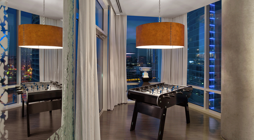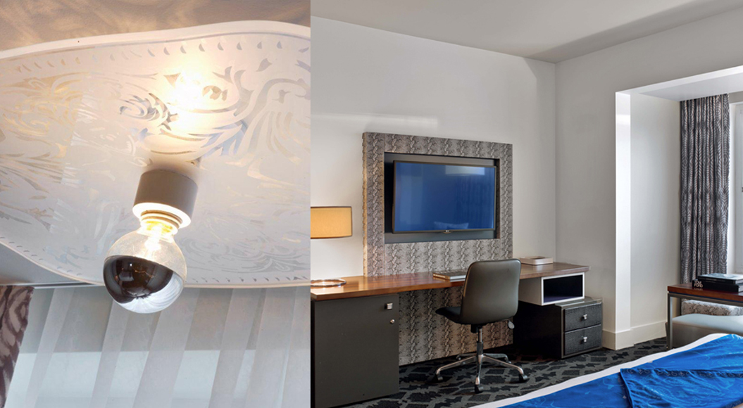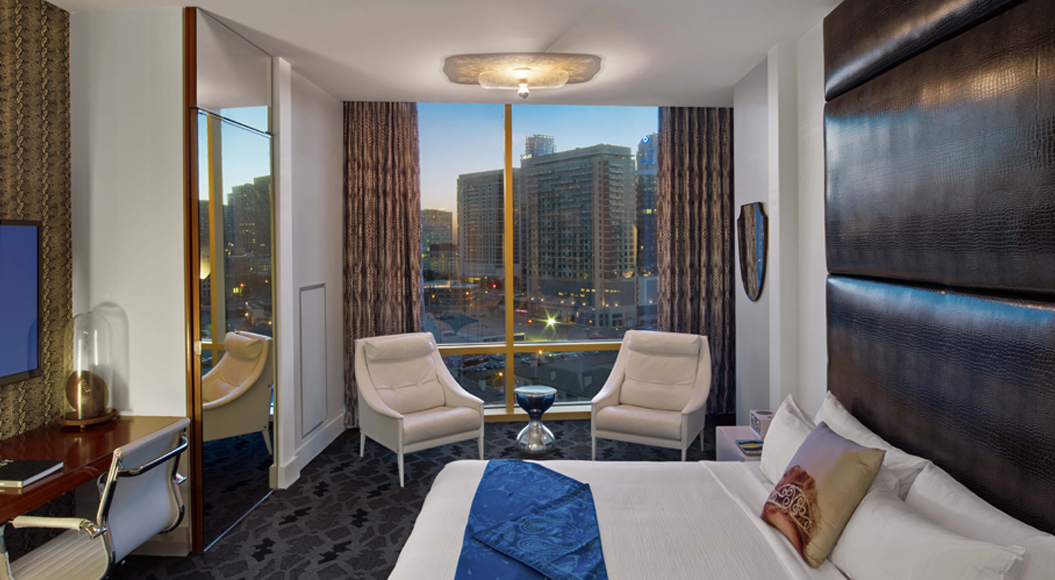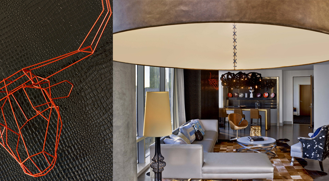 Rough yet refined, intertwined in a culture both high and low, Dallas is expressively masculine and profoundly feminine. Proud and stubborn, yet genuine and unapologetic. It is a city of contrasts, grandeur, celebrity and spectacular wealth. It is in this intersection of glitz and glam, high and low and hyper-gender fantasy where we find our inspiration. Twisted woven ropes, durable ageless denim, individual malleable hides, the luscious viscosity of oil, the distressed surfaces of weathering wood, and the unashamed brandishing of immense gems are just a few of the locally derived tactile inspirations embraced. Honky-tonks, themed neon, chromed mudflap girls and the ubiquitous presence of taxidermy and Texas football all contribute to the cultural inspiration. Striving to present a focused portrait of a place that is not clearly definable, that, at times, defies simple categorization, the design team relied on the reinterpretation and juxtaposition of seemingly contrasting references in order to provide a richness of reading worthy of Dallas and well beyond the simplicity of stereotypical historical narratives. By extracting and distilling aspects of the cultural references into custom elements of the design, the team created a refined and modern pallet that was simultaneously bold and subtle. The custom designed carpet for the guest rooms and corridors is one such element. The sophisticated pattern has a large impact on the spaces it occupies and yet, unbeknownst to most who view it, the pattern is, in fact, made by the repetition of the voluptuous mudflap girl silhouette. Throughout the guestrooms and suites, animal hides are referenced and utilized to provide a richness of texture. Additionally, wooden hooves slyly replace select furniture legs to bring an underlying sense of whimsy to the design.